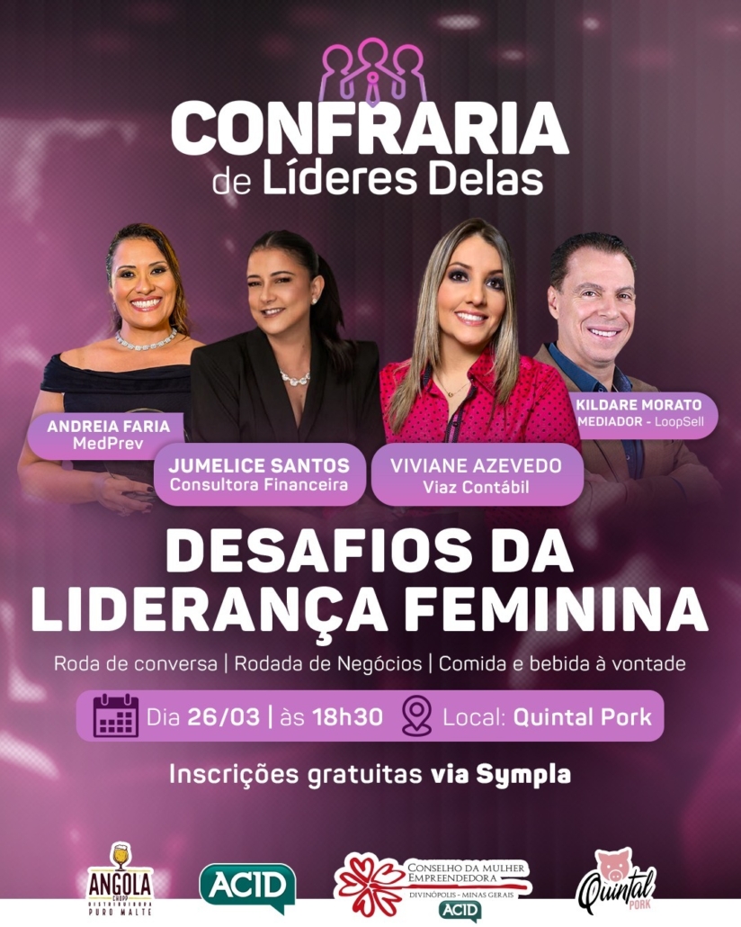 A ACID realiza, no próximo dia 26 de março, a terceira edição da Confraria de Líderes, desta vez em uma versão especial: a Confraria de Líderes Delas. O encontro será dedicado às mulheres que se destacam no ambiente empresarial e integra a programação do calendário especial promovido pela Prefeitura de Divinópolis em comemoração ao Mês da Mulher.