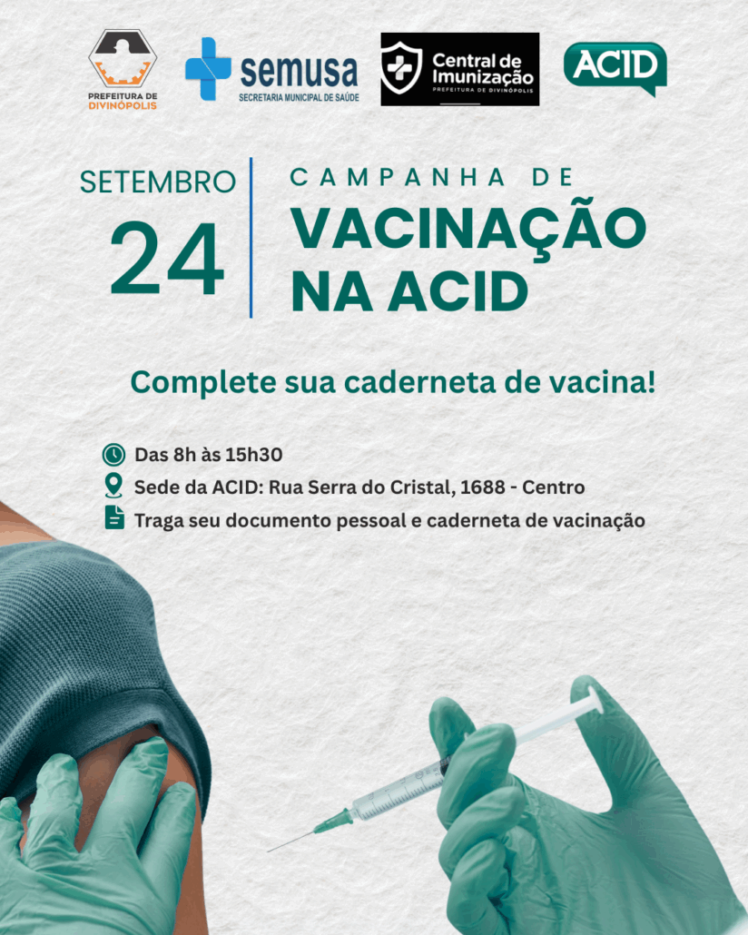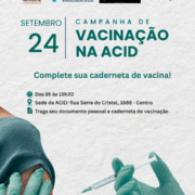 A ACID será ponto de apoio para a Campanha de Vacinação Itinerante da Secretaria Municipal de Saúde de Divinópolis (SEMUSA), que acontecerá no dia 24 de setembro, das 8h às 15h30, na sede localizada na Rua Serra do Cristal, 1688 – Centro.