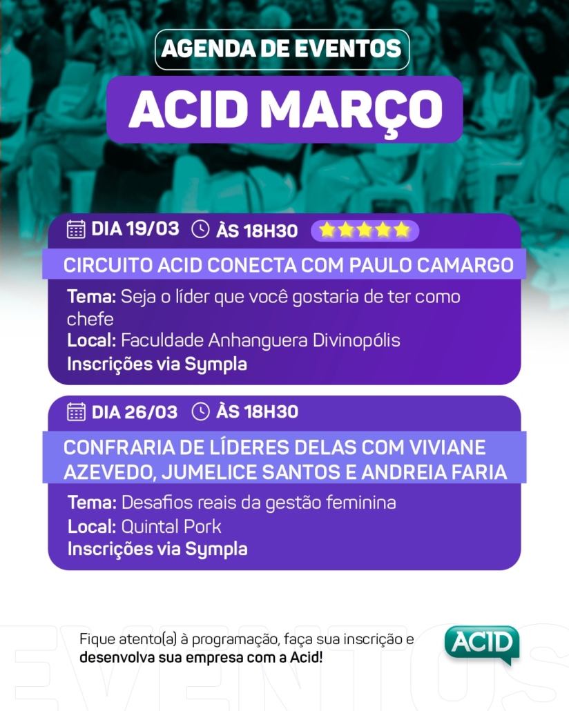 As vagas são limitadas e as inscrições já estão disponíveis via Sympla, garanta sua participação e desenvolva sua empresa com a ACID!
