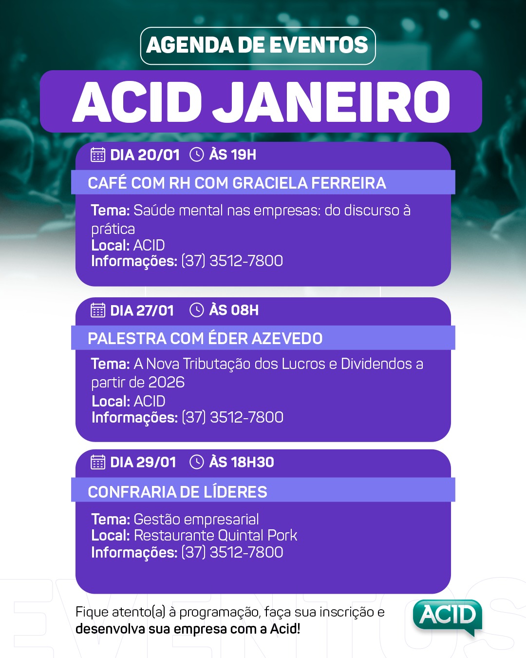 📲 Acompanhe a ACID nas redes sociais, guarde as datas dos próximos encontros e garanta sua participação!