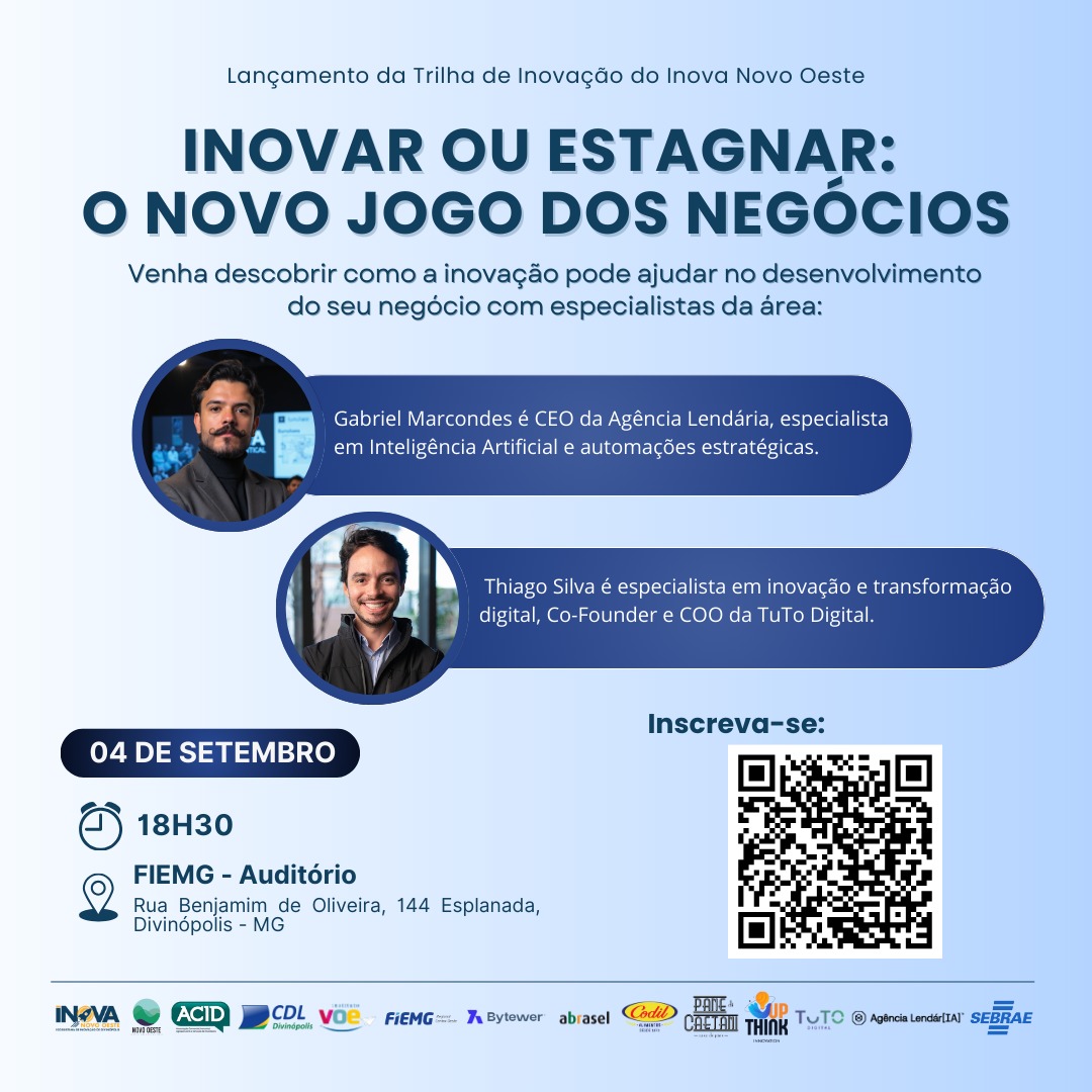 No próximo dia 04 de setembro, a partir das 18h30, no auditório da Fiemg Divinópolis, acontecerá o evento gratuito “Inovar ou Estagnar: O Novo Jogo dos Negócios”, com Gabriel Marcondes e Thiago Silva, dois destaques da inovação nacional que acumulam vivência internacional, experiência em grandes empresas e forte atuação em inovação, estratégia e transformação digital. O evento é organizado pelo Ecossistema de Inovação Inova Novo Oeste, que integra entidades como a ACID, a CDL Divinópolis, instituições de ensino, empresas e governo.